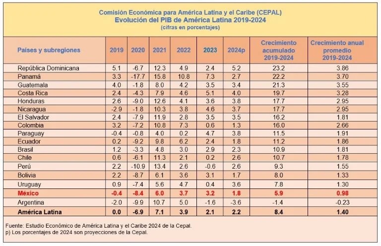 BOGOTÁ (apro).- La Comisión Económica para América Latina y el Caribe (Cepal) ubicó hoy a México como el segundo país con menor crecimiento en la región durante el sexenio de Andrés Manuel López Obrador (2019-2024), con una tasa promedio anual de expansión de sólo 0.98%, la más baja desde el gobierno de Miguel de la Madrid (1983-1988).