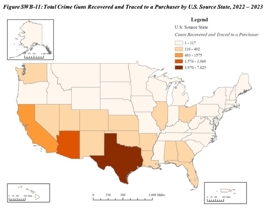 El reporte apunta que en 2023, las autoridades de Estados Unidos aumentaron un 86% los operativos en su territorio para detener armas con destino a México.
