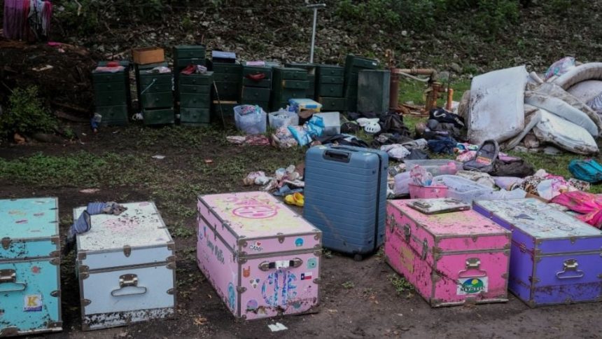 Montones de árboles, colchones, refrigeradores, neveras y canoas ahora cubren las orillas del río. Los escombros también incluían un balón de voleibol, canoas y un retrato familiar.