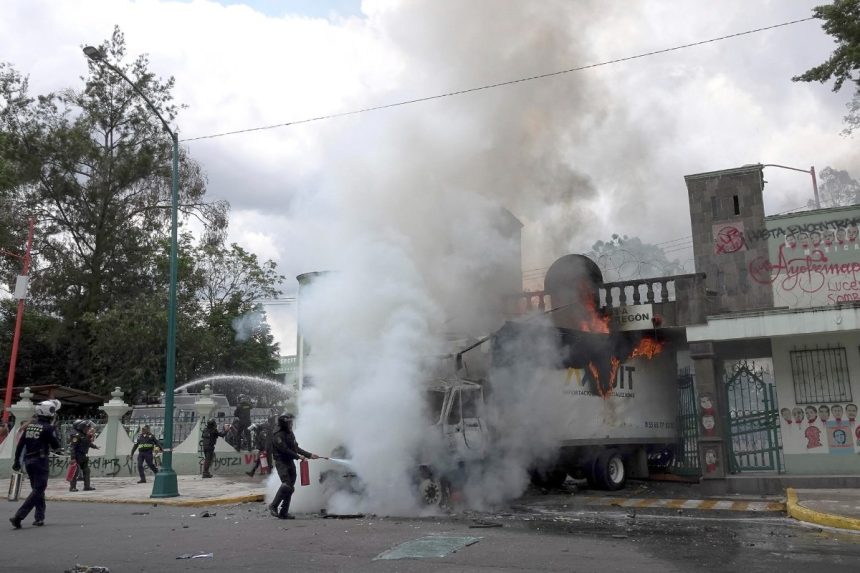 Como parte de las movilizaciones de cara al aniversario 11 de la desaparición de los 43 normalistas de la Escuela Normal Rural Raúl Isidro Burgos, una decena de activistas realizaron pintas, lanzaron explosivos y dirigieron un camión de carga a la puerta del recinto que lograron derribar.
