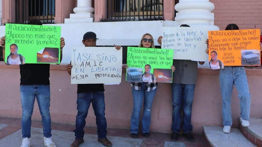 Familiares del joven motociclista que falleció tras ser impactado por un vehículo de la Agencia Ministerial de Investigación Criminal (AMIC), en San Carlos, se manifestaron a las afueras del Poder Judicial del Estado, luego de darse a conocer que el presunto responsable llevará su proceso en libertad.