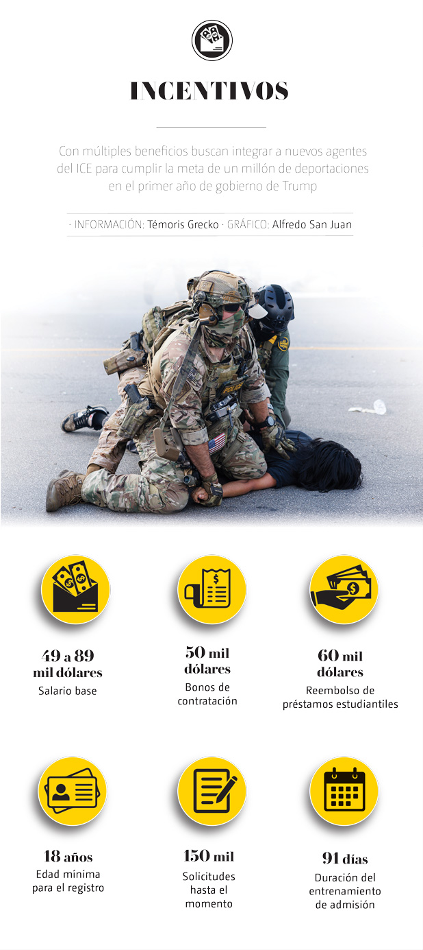 El reclutamiento masivo y acelerado de 10 mil agentes para el Servicio de Inmigración y Aduanas (ICE) y tres mil para la Patrulla Fronteriza requirió de una mezcla de generosos incentivos, flexibilización de requisitos, cancelación de límites de edad, disminución en los estándares de aplicación y verificación, eliminación de exámenes antidoping y relajamiento de prácticas.