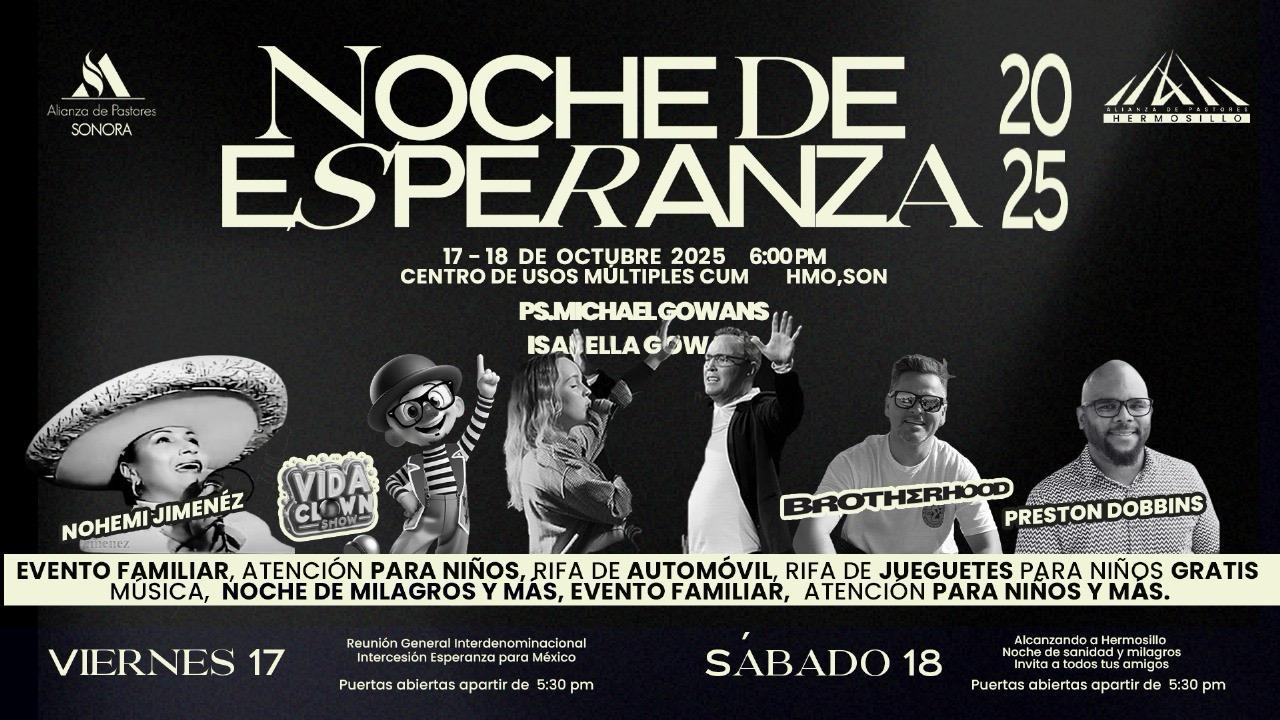 Hermosillo, Sonora; viernes 10 de octubre de 2025.- La Alianza de Pastores de Hermosillo, en unidad con la Alianza de Pastores de Sonora, invitó a la comunidad sonorense a sumarse a la celebración de “Noches de Esperanza”, un evento familiar que representa un mensaje de fe y esperanza.