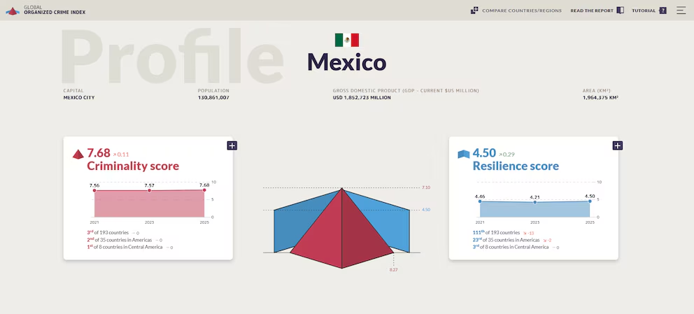 El Índice Global de Crimen Organizado 2025 ubica a México en el tercer lugar mundial, con una calificación de 7.68 sobre 10 en criminalidad y baja resiliencia institucional