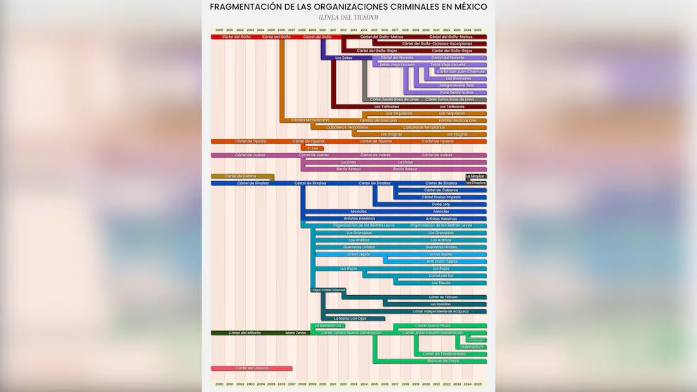 Línea del tiempo donde muestra la fragmentación de los cárteles en México en los últimos 25 años.