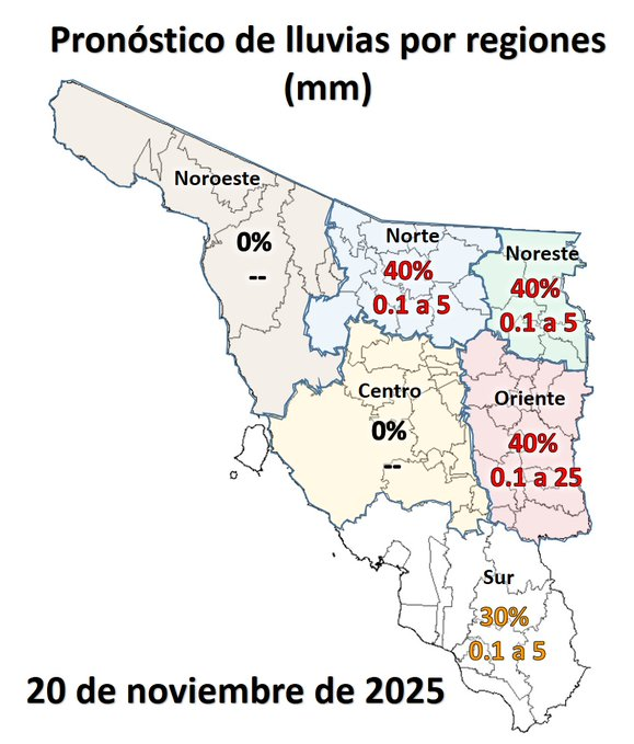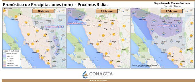 En lo que respecta a Hermosillo, la Conagua pronosticó valores máximos de 26°C el 21 de noviembre y de 22°C el sábado 22 de noviembre, así como 13°C el valor más bajo en la ciudad.