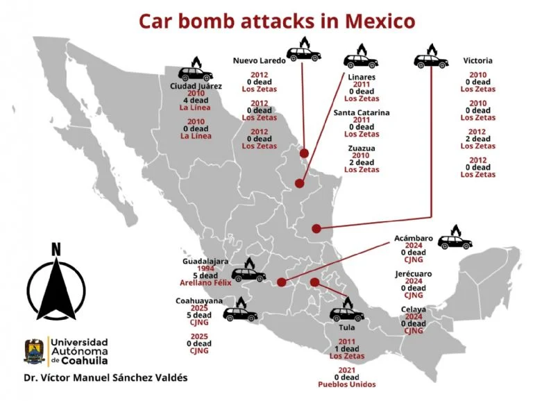 El investigador Víctor Manuel Sánchez Valdés, de la Universidad Autónoma de Coahuila (UAdeC), doctor por el CIDE especialista en seguridad pública, hizo un recuento de 20 atentados con coches bomba en México de 1994 a la fecha.