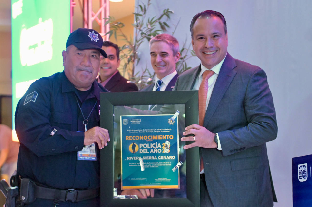 Hermosillo, Sonora; 6 de enero, 2026.- El presidente municipal, Antonio Astiazarán Gutiérrez, reconoció la labor y esfuerzo diario de los elementos de la Policía de Hermosillo en el evento por la celebración por su día en el que entregó el premio al Policía del Año 2025, a Genaro Rivera Sierra quien durante veintiocho años ha servido a Hermosillo con constancia y responsabilidad.