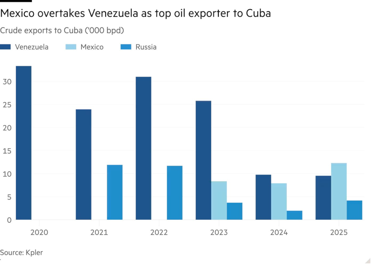 En 2025, México se convirtió en el principal proveedor de petróleo de Cuba, desplazando a Venezuela, indica una nota del Financial Times de Reino Unido titulada “México se arriesga a la ira de Trump con los envíos de petróleo a Cuba”.