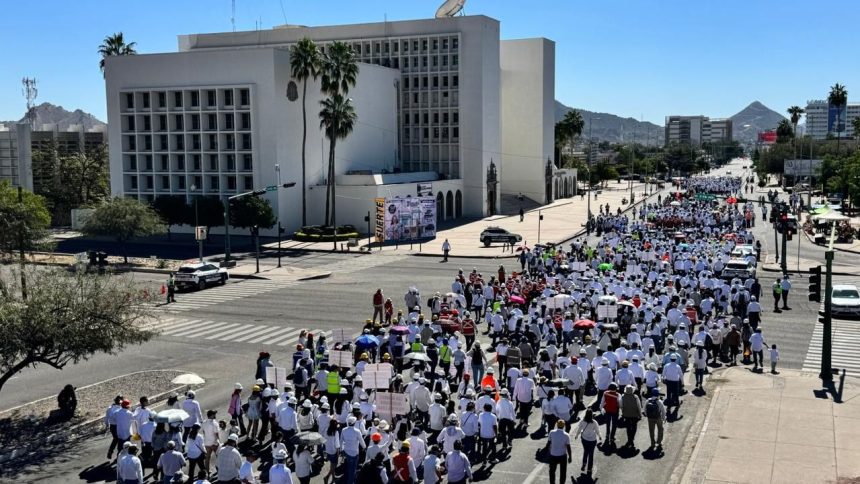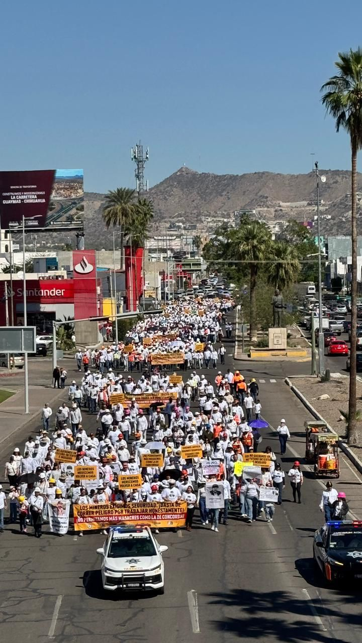 Hermosillo, Sonora.- Integrantes del sector minero en Hermosillo realizaron este día una marcha pacífica por las principales calles de la ciudad, exigiendo justicia y mejores condiciones de seguridad tras la desaparición y asesinato de compañeros en Concordia, Sinaloa.