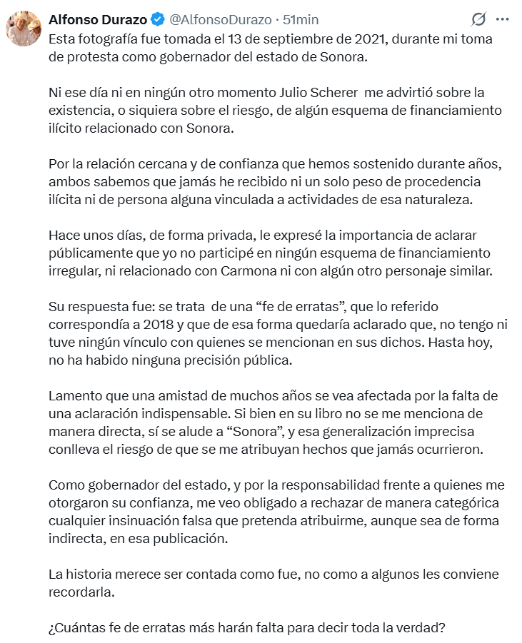El conflicto surge a raíz de publicaciones recientes donde se alude a presuntas irregularidades en Sonora. Aunque Durazo señaló que no se le menciona directamente, la generalización imprecisa en la obra de Scherer ha generado un vacío que el gobernador exige llenar con la verdad.