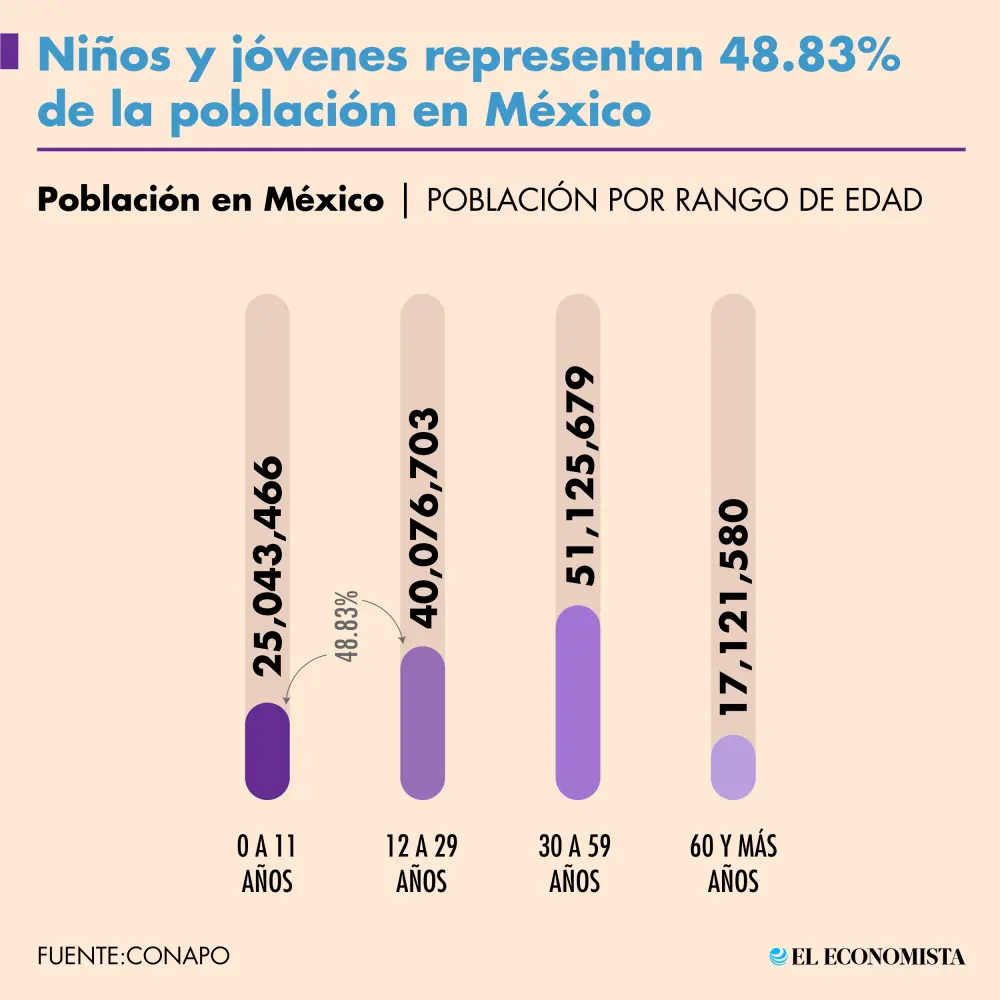 Con base en las tendencias estadísticas del Conapo, se estima que para el 2030 habrá 23.4 millones de niños entre 0 y 11 años (16.7% de la población); 38.7 millones de jóvenes de entre 12 y 29 años (27.7%) y 22.1 millones de adultos mayores, es decir de 60 años o más (15.9%).
