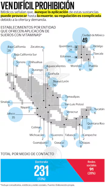 En la Ciudad de México hay al menos 49 lugares donde el suero se administra vía intravenosa, aun cuando no es recomendado por expertos. En Jalisco hay 35; en Baja California, 28; Estado de México, 26; en Quintana Roo, 22; en Querétaro, 21, y en Nuevo León y Puebla se localizan 16, respectivamente.