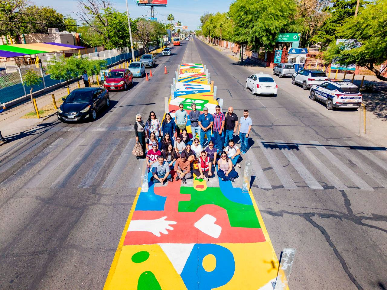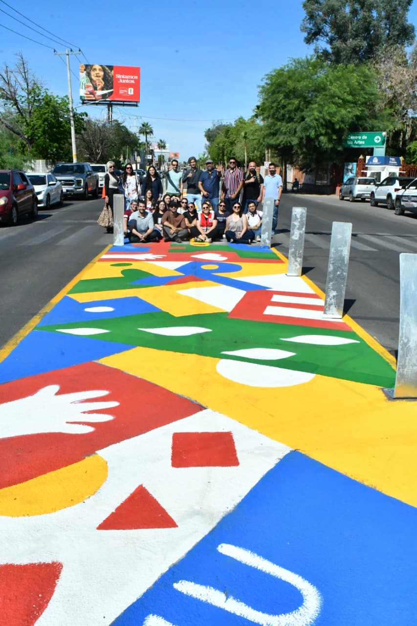 Hermosillo, Sonora; lunes 13 de abril de 2026.- El cruce del bulevar Luis Donaldo Colosio y la calle Galeana dejó de ser un punto de tránsito común para convertirse en un lienzo donde el arte de Enrique Chiu, junto a más de 50 personas voluntarias entre estudiantes de artes y arquitectura y sociedad civil, dio vida a la primera intervención de la iniciativa “Asphalt Art”, impulsada por Bloomberg Philanthropies en coordinación con el Ayuntamiento de Hermosillo que encabeza Antonio Astiazarán Gutiérrez.