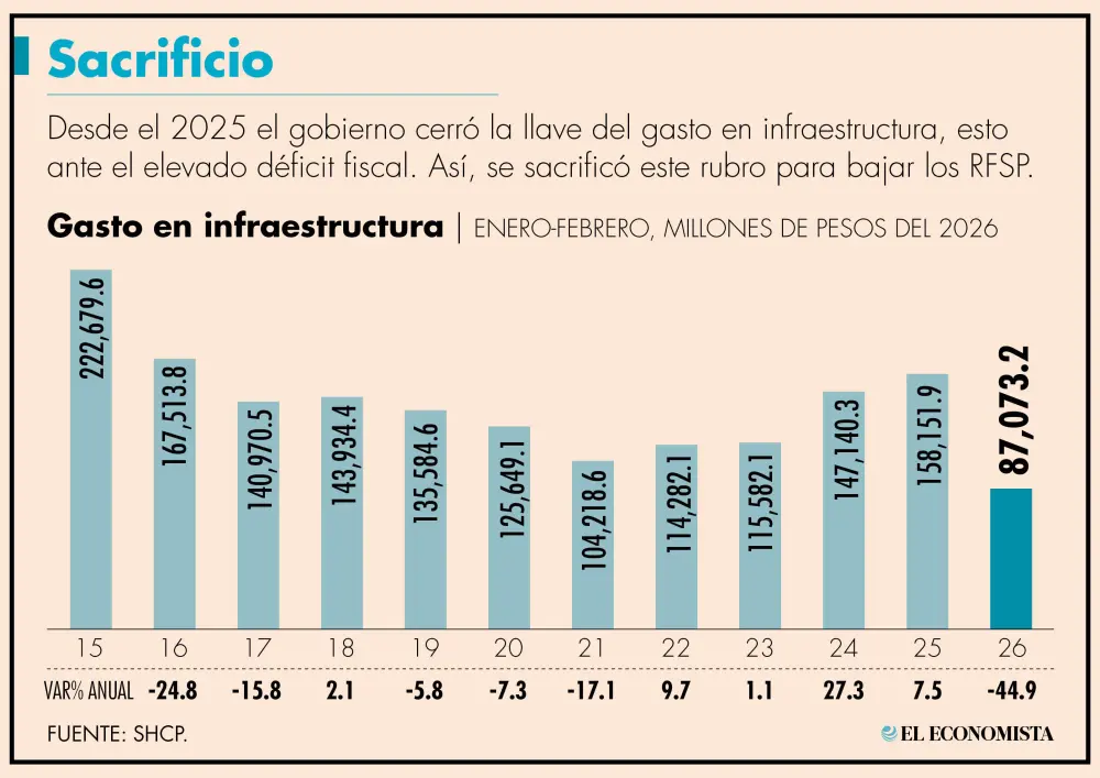 El informe de Finanzas Públicas y la Deuda Pública a febrero mostró que el gasto público en infraestructura sumó 87,073 millones de pesos, una caída de 44.9% en comparación con el mismo periodo del año pasado.